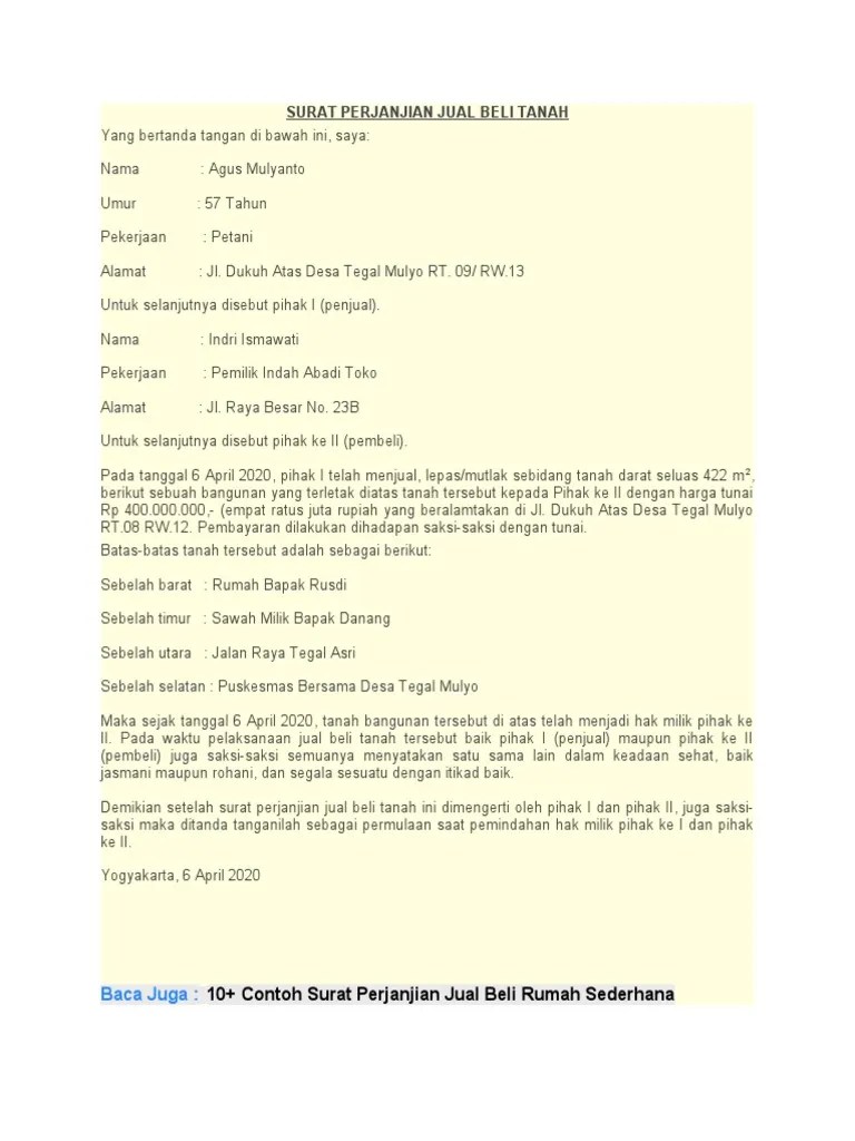 Berikut contoh surat perjanjian jual beli tanah bermaterai untuk . Di contoh surat pernyataan jual beli tanah, cantumkan juga tanggal pembayaran terakhir untuk pelunasan . Dokumen surat perjanjian jual beli tanah ini umumnya dibuat dengan bantuan notaris. Saat melakukan transaksi ini, harap diperhatikan surat perjanjiannya. Demikian surat perjanjian jual beli rumah ini dibuat dengan penuh kesadaran dan tanpa paksaan antara para pihak dan supaya dipatuhi sebagai . Jika anda belum pernah membuat kwitansi jual beli tanah, jangan bingung karena anda dapat .